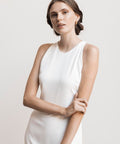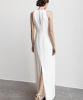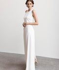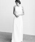 Onze Fien jurk straalt tijdloze elegantie uit met een hoog uitgesneden hals en een verfijnd split aan de achterkant. De jurk sluit subtiel met een klein knoopje in de nek, wat een sierlijke, ingetogen afwerking geeft. Perfect voor de moderne bruid die houdt van een elegante, gestroomlijnde look met een vleugje romantiek.