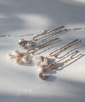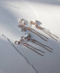 Flooded with organic stripes, these hairpins are composed entirely of keshi pearls. Keshi pearls are composed purely of pearl, the luminous coating on all pearls, so they have a particularly interesting luster and are more iridescent than normal pearls. This set of four hairpins is hand wired with tarnish-resistant gold wire. Each set will have slight variations given the more organic appearance of keshi pearls. DIMENSION Each hairpin is approximately 3" - 3 ½" (three to three and a half inches) long. The pearls range from 5mm to 12mm wide.