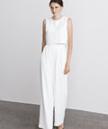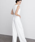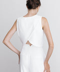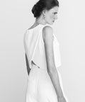 De Juul top heeft een mouwloos ontwerp met een hoge, ronde halslijn die is afgewerkt met verfijnde knoopdetails op de schouder. Aan de achterzijde kruisen twee overlappende panden elkaar in een elegante V-vorm, waardoor een subtiele opening op de rug ontstaat. De soepele stof zorgt voor een minimalistische en moderne uitstraling, perfect voor de eigentijdse bruid die houdt van eenvoud met een verfijnd silhouet.